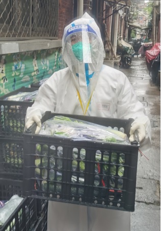 物资发放是民生保障基础,不仅要准确,还要及时。记得那天物资运来时,天公不作美,正巧下起了滂沱大雨,考虑到蔬菜不易存放时间过长,需及时发放,我和块长以及伙伴们冒着大雨,一次又一次搬起蔬菜塑料箱穿梭在小区弄堂里。此时,雨水已将面罩打湿,内里已经布满雾气,视线朦胧,穿了两层的防护鞋套也顶不住雨水的侵袭,走起来发出“咯吱咯吱”的声音。即便如此,我们配送的热情并没有被雨水所浇灭,依旧踩着地面积水奋勇前行,将物资送到所有居民手中。